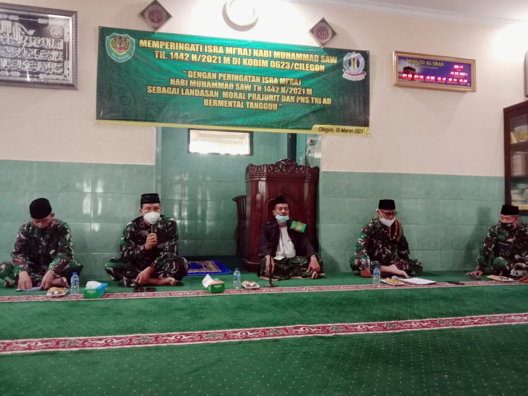 Kapten Inf Wasis Pasi Pers Kodim 0623/Cilegon menyampaikan Pada hari Rabu tanggal 10 Maret 2021 Pukul 08.00 s.d 09.30 Wib di Musholla Al – Iman Kodim 0623/Cilegon telah dilaksanakan kegiatan Memperingati Isra Mi’raj 1442 H dengan tema “Dengan Peringati Isra Mi’raj Nabi Muhammad SAW TH 1442 H/2021 M Sebagai Landasan Moral Prajurit dan PNS TNI – AD Bermental Tangguh” dengan diikuti, Militer 24 Orang, PNS 4 Orang, Sipil 2 Orang Jadi jumlah 30 Orang, terangnya.