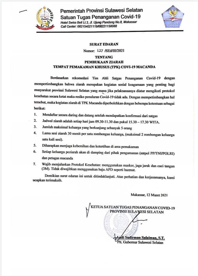 MAKASSAR – Pemerintah Provinsi Sulawesi Selatan mengeluarkan Surat Edaran Tentang Pembukaan Ziarah Tempat Pemakaman Khusus (TPK) Covid 19 di Macanda, Kabupaten Gowa.