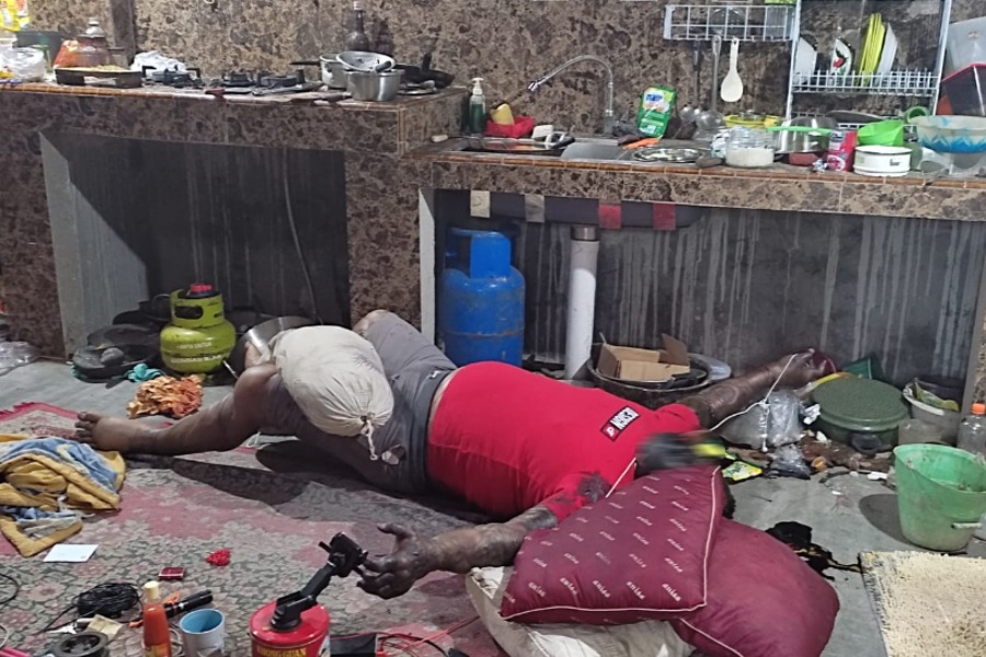 Pada saat ditemukan korban dalam posisi tergeletak terlentang diruang dapur, kondisi badan sudah membengkak dan sudah tercium bau membusuk, selain itu disalah satu tangan korban masih menyentuh kabel yang terhubung ke aliran listrik.