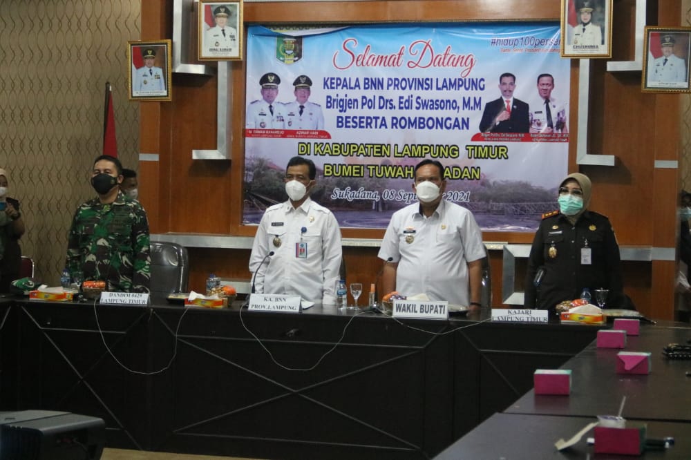 LAMPUNG TIMUR – Kepala kantor Badan Narkotika Nasional (BNN) Provinsi Lampung Brigjen Pol Drs. Edi Swasono, M.M beserta rombongan lakukan kunjungan kerja di Kabupaten Lampung Timur, Rabu (8/9/3021).