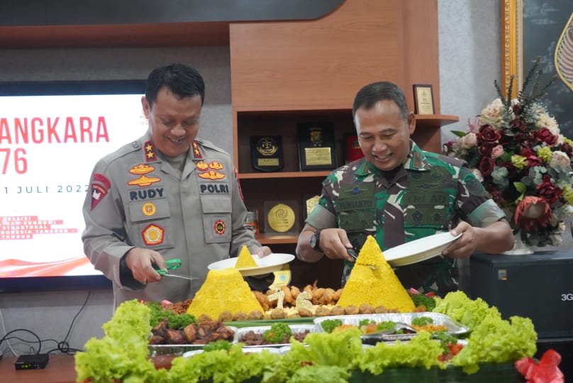 Acara perayaan HUT Bhayangkara ke-76 dilaksanakan secara sederhana dengan diawali ramah tamah pemberian ucapan dari TNI kepada Polda Banten yang berlangsung secara khidmat dan dilanjutkan dengan pemotongan tumpeng oleh Kapolda Banten dan diberikan kepada Danrem 064/MY, Danlanal Banten, serta diberikan kepada Kowad, Kowal, dan Polwan Polda Banten.