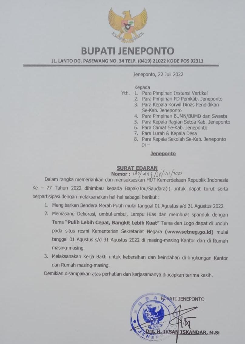 Himbauan ini berdasarkan dengan dikeluarkannya surat edaran Bupati Nomor tentang pengibaran bendera merah putih dan pemasangan umbul-umbul dalam rangka memperingati HUT Republik Indonesia yang Ke- 77 Tahun 2022. Dihimbau Kepada Bapak/Ibu/Saudara(i) untuk dapat turun berpartisipasi dengan melaksanakan yakni.