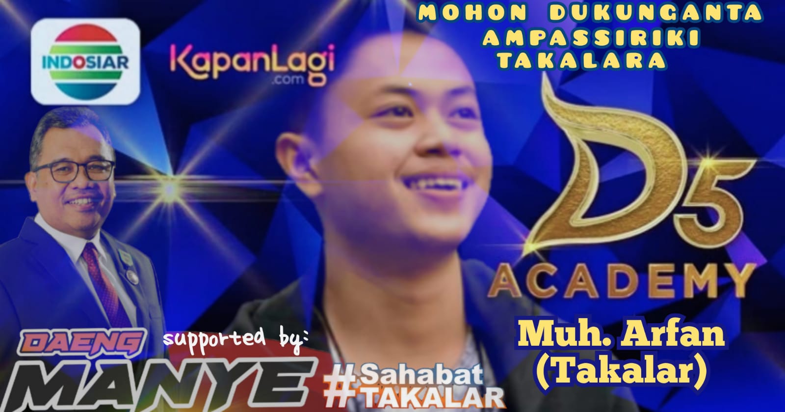 Sekedar di ketahui bahwa sahabat takalar terhadap arfan memperkenalkan kepada masyarakat, memfasilitasi keberangkatan dan kedatangan termasuk mengantar dari rumah arfan sampai ke bandara hasanuddin dengan pengawalan mobil patroli serta selama di Jakarta Daeng Manye terus memonitor dan memberikan semangat serta hal lainnya agar persiapan menghadapi perlombaan academy D5 indosiar, arfan bisa focus dan membawa keharuman bagi masyarakat Takalar.Tutup Ir H.Firdaus Daeng Manye