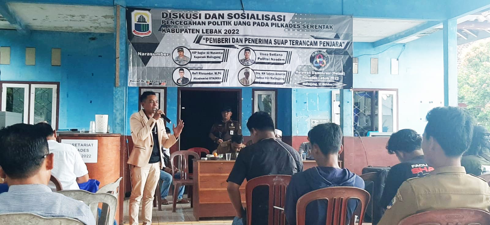 Sekilasindonesia.id ||LEBAK – Relawan Demokrasi (Relasi) Pilkades Lebak 2022 menggelar acara diskusi dan sosialisasi Pencegahan Politik Uang pada Pilkades Serentak Kabupaten Lebak 2022. Kegiatan bertempat di Aula Kantor Desa Sumberwaras, Kecamatan Malingping, Kabupaten Lebak, Selasa (18/10/2022).