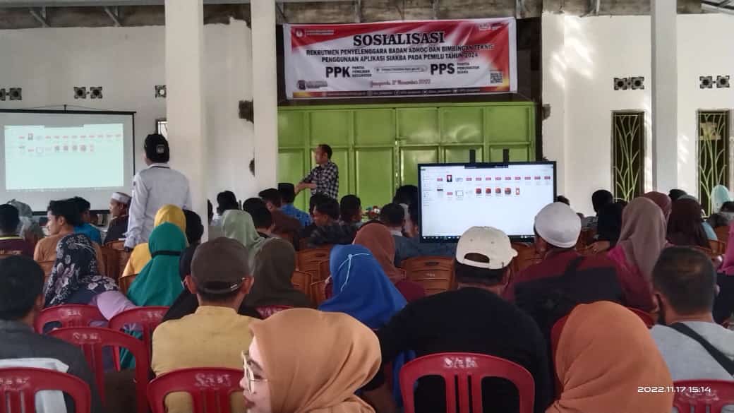 Terlihat, para peserta ikut sosialisasi antusiasme mereka mendengarkan arahan tentang penggunaan Aplikasi SIAKBA pada pendaftaran Panitia Pelaksana Kecamatan (PPK) dan Panitia Pemungutan Suara (PPS).