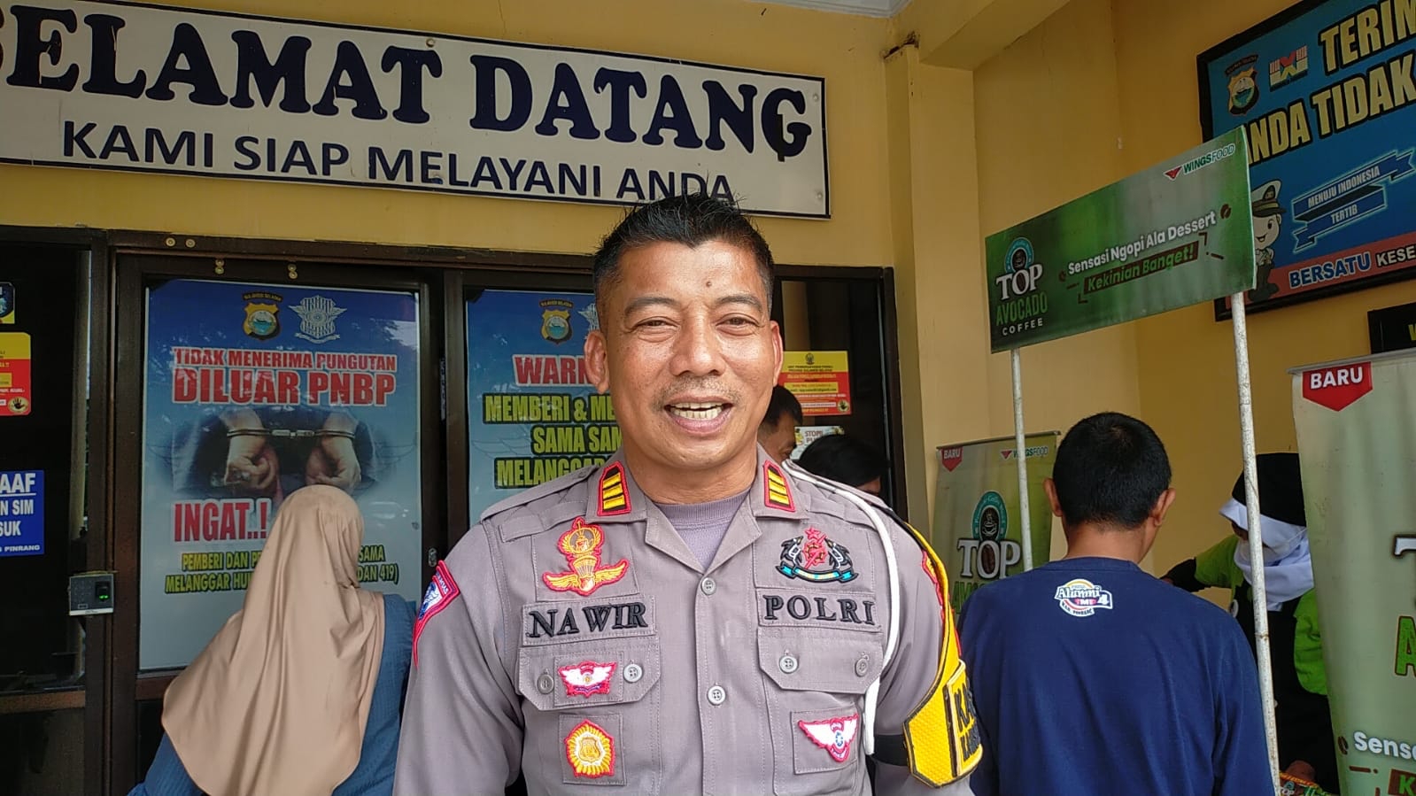 Kasat Lantas Polres Pinrang AKP Nawir Eming bersama personil Satpas SIM Satlantas Polres Pinrang bekerjasama dengan pihak TOP Avocado Coffee memberikan pelayanan yang unik dengan menyediakan segelas kopi panas kepada para pengunjung untuk mengusir rasa jenuh dan bosan saat menunggu nomor antrian,selasa (03/01/2023)