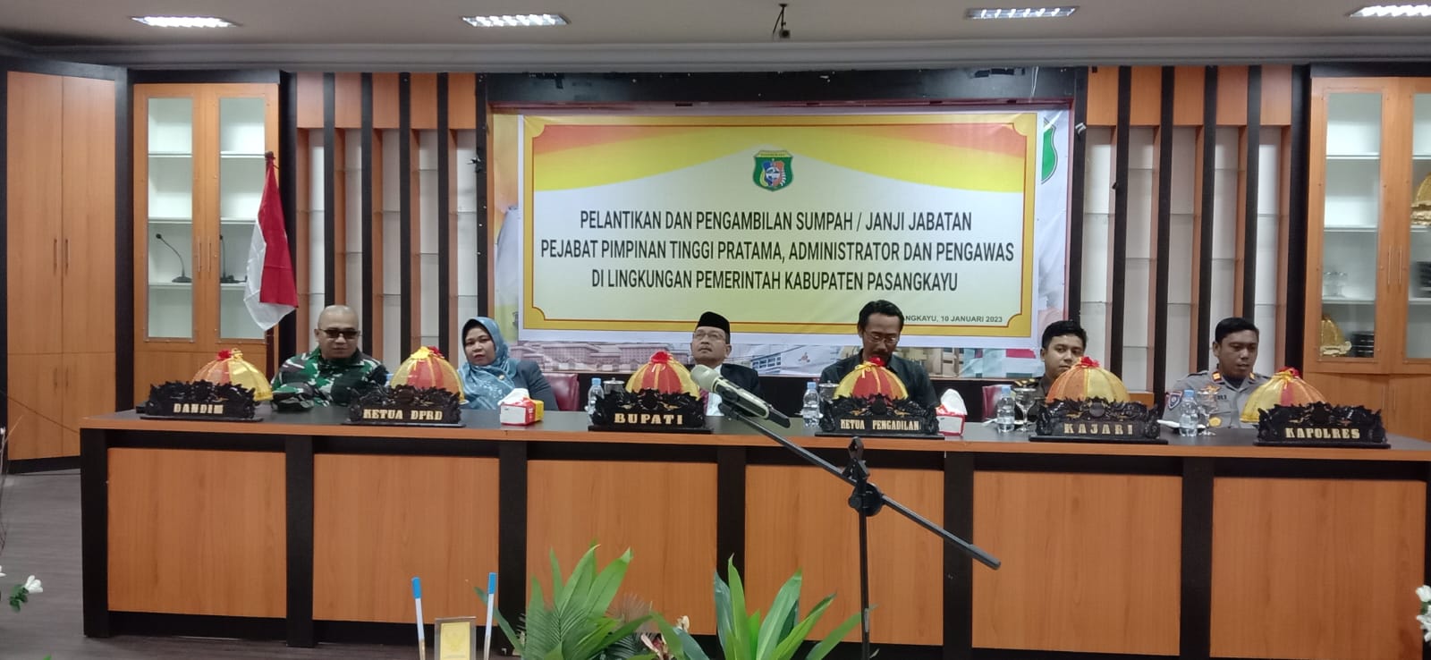 Pengambilan Sumpah dan pelantikan pejabat tinggi pratama eselon II 9 orang, pejabat Administrator eselon III 45 orang dan pengawas lingkungan Pemkab Pasangkayu eselon IV sebanyak 38 orang disaksikan oleh Seketariat Daerah (Sekda) Rahmat K Turusi, S.Sos dan Imran Makmur, S.Pi, M.Si.
