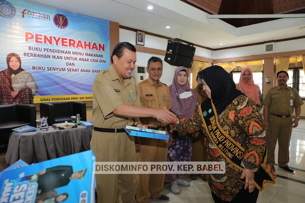 Selain menyerahkan Buku Menu Makanan Berbahan Ikan untuk Anak Usia Dini dan Buku Senyum Sehat Anak Babel, Sri Utami juga berpesan agar Dinas Pendidikan melalui Pokja Bunda Paud, PKK serta komunitas dapat terus mensosialisasikan pentingnya sarapan di pagi hari bagi anak-anak.
