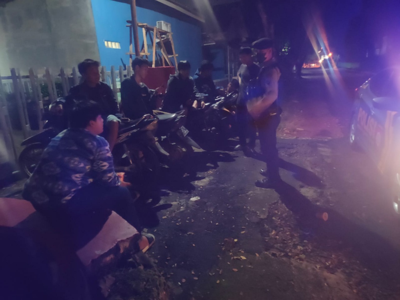 Personil Samapta Polres Metro Polda Lampung terlihat sedang memberikan arahan atau pesan kepada anak remaja yang sedang nongkrong di tepi jalan.