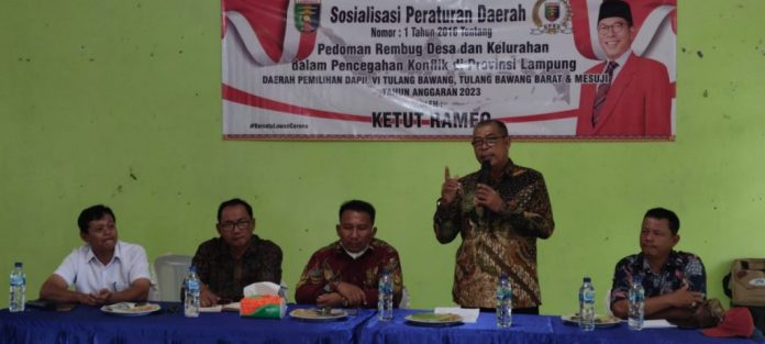 Salah satunya Ketut Rameo yang menggelar kegiatan sosialisasi peraturan daerah di kampung Penawar Jaya, Kecamatan Banjar Margo, Kabupaten Tulang Bawang. Jumat 27 Januari 2023.