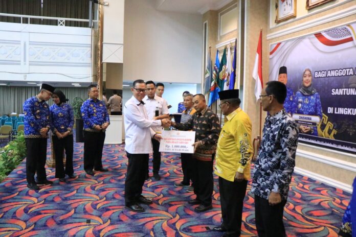 Sekretaris Daerah Provinsi Lampung Fahrizal Darminto yang juga selaku Ketua Dewan Pengurus Korpri Provinsi Lampung menyerahkan bantuan Tali Asih bagi anggota Korpri di Lingkungan Pemerintah Provinsi Lampung yang telah memasuki Purna Bakti dan Santunan bagi anggota Korpri yang meninggal dunia, kegiatan dilaksanakan di Lt.3 Gedung Balai Keratun, Kamis (02/03/2023).
