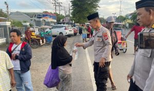 Sekilasindonesia.id.MAROS.SULSEL-Personil kepolisian Resor Maros Polda Sulawesi selatan membagikan 100 porsi “Nasu Palekko” (makanan khas bugis) sebagai takjil kepada pengguna jalan di jalan Jendral Sudirman,Turilale,Kabupaten Maros,Rabu (5/4/2022).
