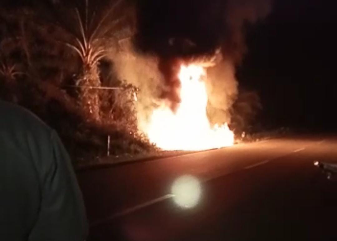 Satu unit mobil jenis carry warna mera membawa BBM menggunakan jeriken terbakar di Desa Pergam, Kecamatan Toboali, Kabupaten Bangka Selatan, pada Minggu (9/4/2023) dini hari.