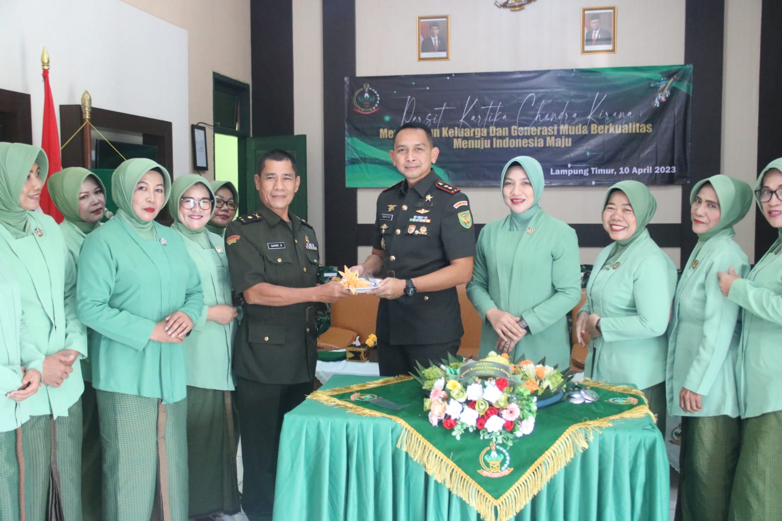 Dandim 0429/Lamtim Letkol Czi. Indra Puji Triwanto, SH bersama Ketua Persit KCK Cabang LIV Ny. Indra Puji mengikuti Video Conference (Vicon) peringatan HUT Persit Kartika Chandra Kirana Yang Ke-77, bertempat di ruang data Makodim, Jl. Soekarno-Hatta, Desa Mataram Marga, Kecamatan Sukadana, Kabupaten Lampung Timur, Senin (10/4/2023).