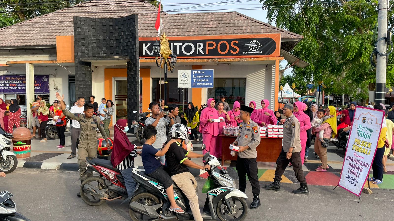 Polsek Toboali bersama Bhayangkari memanfaatkan bulan suci ramadhan 1444 Hijriah dengan membagikan takjil untuk berbuka puasa kepada pengguna jalan, di kawasan pedestrian Himpang Lime, Senin (10/4/2023).