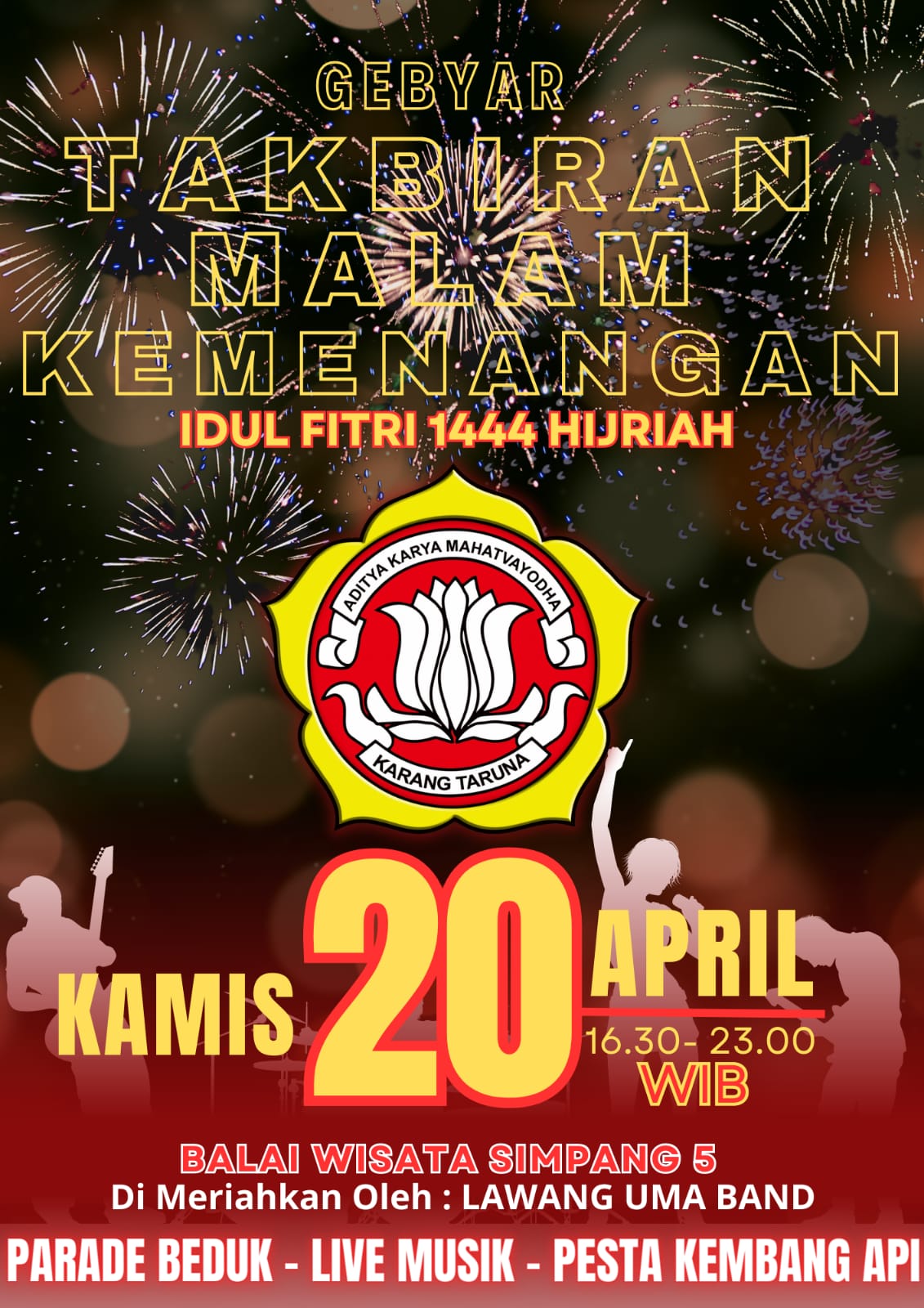Kegiatan tersebut, akan dimeriahkan dengan Parade Beduk, Pesta Kembang Api, dan Live Musik yang akan diisi oleh band lokal Bangka Selatan, yaitu Lawang Uma Band.