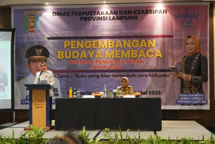 Bunda Literasi Provinsi Lampung Riana Sari Arinal membuka acara Pengembangan Budaya Membaca bersama Penggiat Literasi se-Provinsi Lampung Tahun 2023, di Hotel Sheraton (29/05/2023).