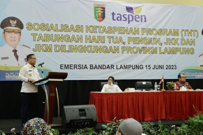Gubernur Lampung diwakili oleh Asisten Administrasi Umum Senen Mustakim membuka acara Sosialisasi Ketaspenan Program (THT) Tabungan Hari Tua, Pensiunan, JKK dan JKM dilingkungan Pemerintah Provinsi Lampung, bertempat di Hotel Emersia, Kamis (15/06/2023).