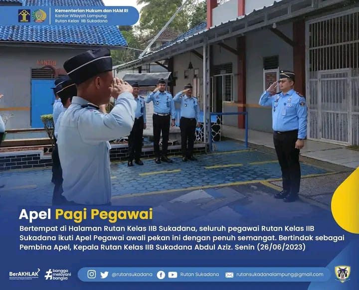Bertindak sebagai Pembina Apel, Kepala Rutan Kelas IIB Sukadana Abdul Aziz. Kegiatan apel juga diikuti lengkap oleh seluruh pejabat struktural, Kasubsi Pengelolaan Asnawi, Kepala KPR Abi Aufa Al Qohhar, dan Kasubsi Pelayanan Tahanan Romzi B.