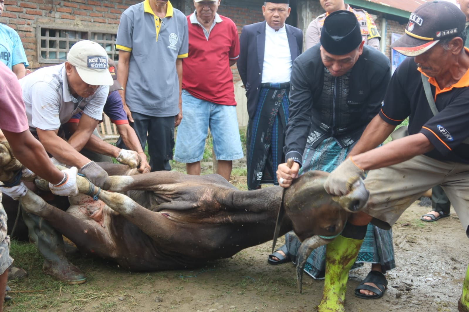 Saat meninjau pelaksanaan pemotongan hewan qurban, Amran Mahmud juga menyempatkan memotong sendiri hewan qurbannya.