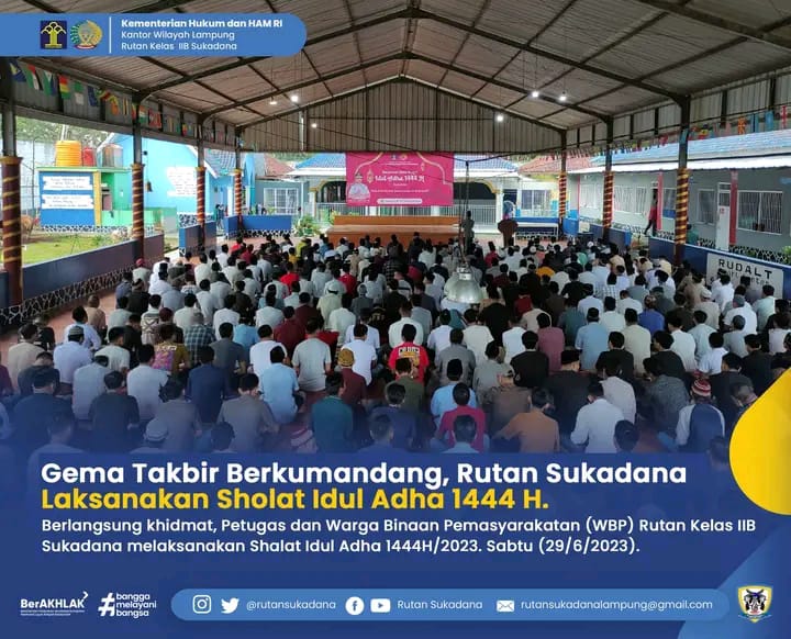 Gema takbir Hari Raya Idul Adha 1444 H dirasakan dengan bahagia oleh seluruh jajaran petugas dan Warga Binaan Pemasyarakatan (WBP) Rutan Sukadana.