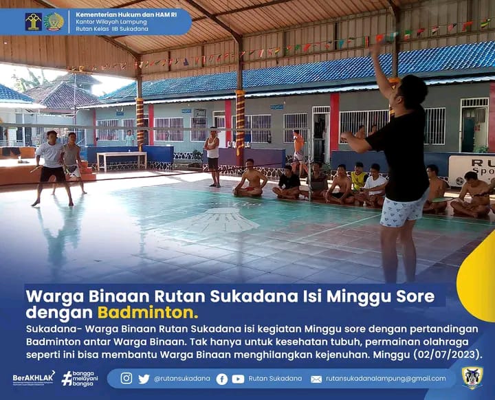Warga Binaan Rutan Kelas IIB Sukadana isi kegiatan Minggu sore dengan pertandingan Badminton antar Warga Binaan. Tidak hanya untuk kesehatan tubuh, namun juga menghilangkan kejenuhan Warga Binaan. Minggu, (02/07/2023).