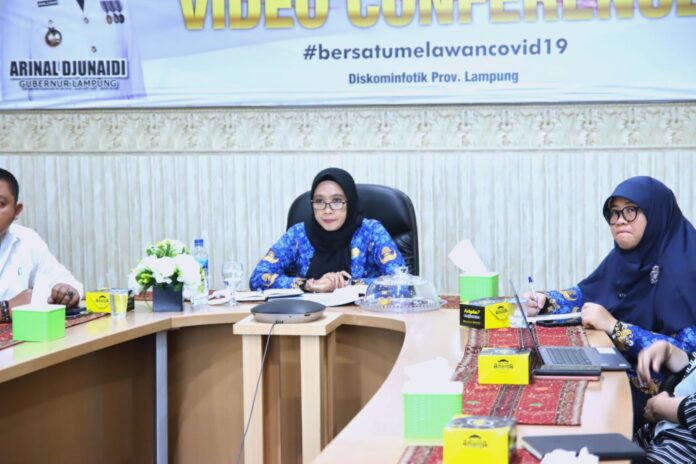 Pemerintah Provinsi Lampung diwakili oleh Kepala Dinas Perindustrian dan Perdagangan Provinsi Lampung, Elvira Umihanni didampingi sejumlah perwakilan Perangkat Daerah, mengikuti Rapat Koordinasi Pengendalian Inflasi Daerah secara _virtual_ yang dipimpin oleh Menteri Dalam Negeri, Tito Karnavian, di Ruang Command Center Lt. II Dinas Kominfotik Provinsi Lampung, Senin (17/07/2023).