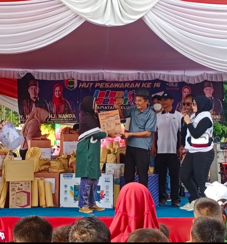 saat mengikuti Jalan Sehat dalam rangka memperingati Hari Jadi ke-16 Kabupaten Pesawaran bersama ribuan masyarakat di Desa Hanura Kecamatan Teluk Pandan, pada Minggu (30/7/2023).