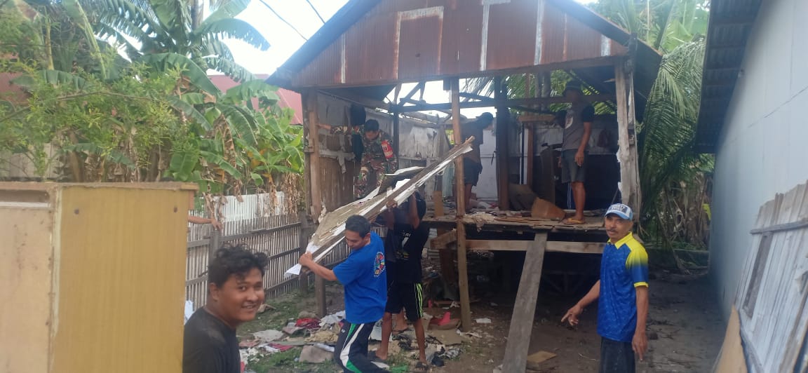 Selayar, Sekilas Indonesia – Babinsa Desa Bonerate, Koramil 1415-03 Pasimarannu, Kodim 1415/Selayar, Kopda Muliadi bersama warga saling bahu – membahu (bergotongroyong) membongkar rumah kayu milik Muh. Abduh warga Desa Bonerate, Kecamatan Pasimarannu, Kabupaten Kepulauan Selayar, Minggu 06 Agustus 2023 pagi.