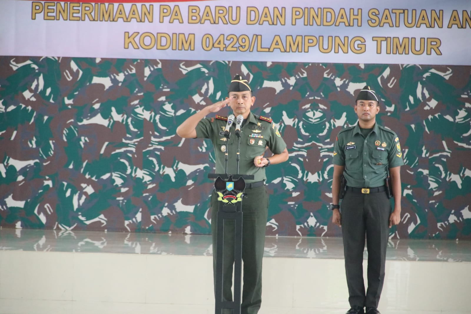 Acara Tradisi penerimaan Perwira baru dan anggota pindah Satuan dipimpin langsung Dandim 0429/Lamtim Letkol Czi. Indra Puji Triwanto, SH, bertempat di Aula Gatot Soebroto, Jl. Soekarno-Hatta, Desa Mataram Marga, Kecamatan Sukadana, Kabupaten Lampung Timur, Senin (28/8/2023).