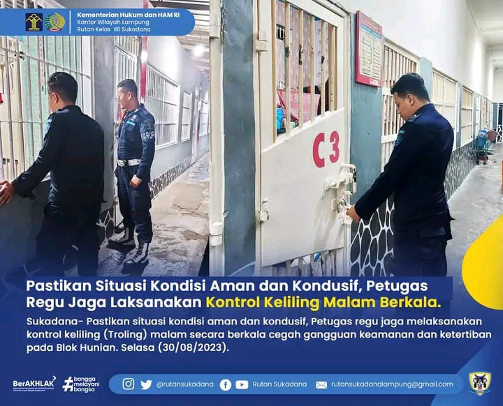 Pastikan situasi kondisi aman dan kondusif, Petugas regu jaga melaksanakan kontrol keliling (Troling) malam secara berkala cegah gangguan keamanan dan ketertiban pada Blok Hunian. Selasa, (30/08/2023).