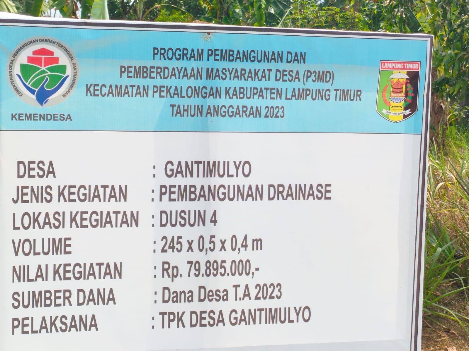 Desa Gantimulyo Kecamatan Pekalongan Kabupaten Lampung Timur, bersumber dari Anggaran Pendapatan Belanja Negara (APBN) yang terealisasikan melalui Dinas Program Pembangunan dan Pemberdayaan Masyarakat Desa (P3MD) kabupaten setempat. Nampak di sudah melaksanakan pembangunan Drainese di Dusun 4. Rabu (13/09/2023).