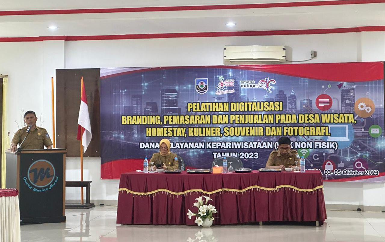 Sekilasindonesia.id, || Bangka Selatan – Pemerintah Kabupaten Bangka Selatan melalui Dinas Pariwisata, Kepemudaan, dan Olahraga Kabupaten Bangka Selatan menggelar Kegiatan Pelatihan Digitalisasi dengan Tema Branding, Pemasaran dan Penjualan Pada Desa Wisata, Homestay/Pondok Wisata, Souvenir dan Fotografi di Hotel Grand Marina Toboali, Selasa (3/10/23).