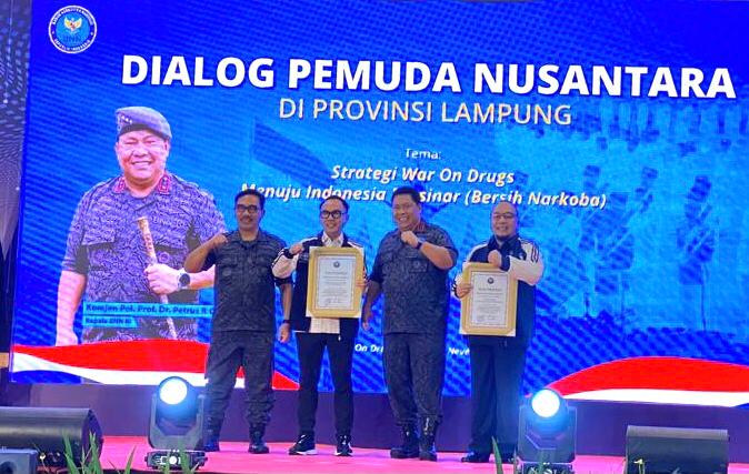 Badan Narkotika Nasional Republik Indonesia (BNN RI) berikan penghargaan kepada Ketua DPD GRANAT Provinsi Lampung dan Bupati Kabupaten Way Kanan dalam acara Dialog Muda Nusantara, yang digelar di Ballroom Swissbell Hotel Bandar Lampung, Rabu (18/10/2023).