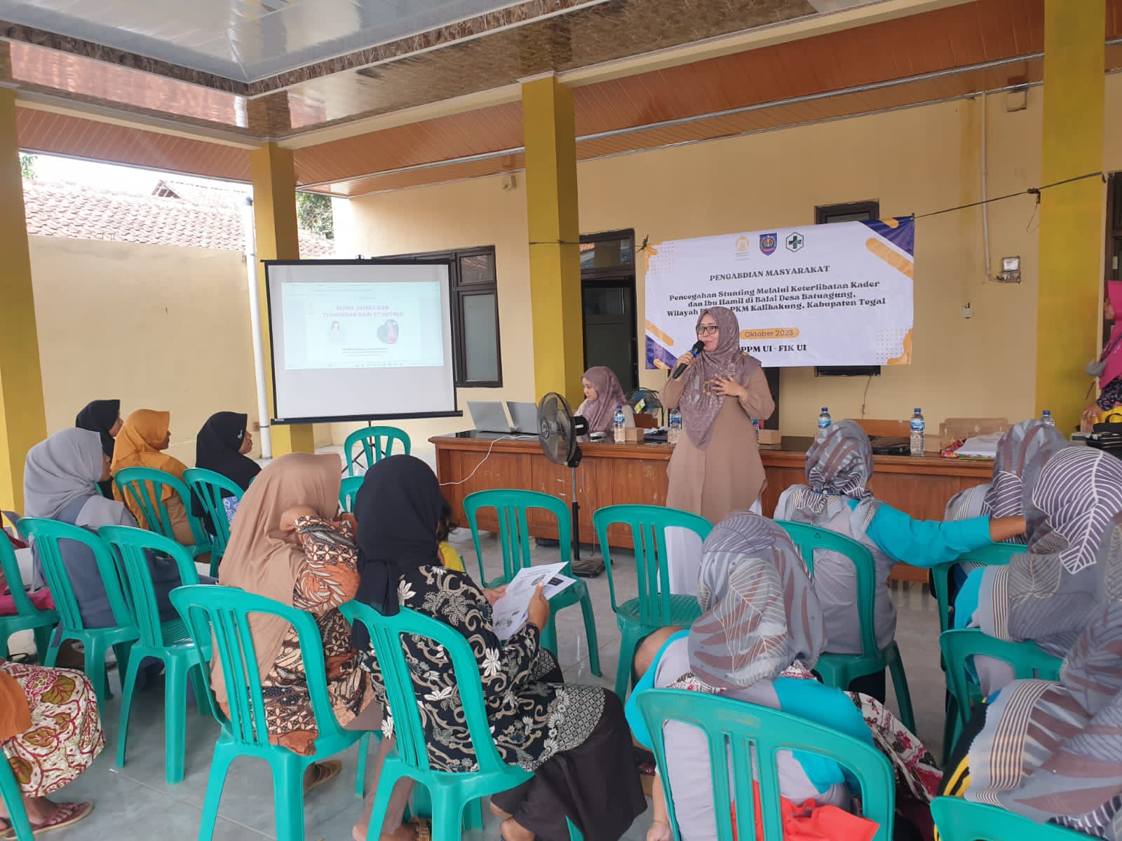 Di saat yang sama, 10 ibu hamil didampingi 15 kader menerima pemaparan materi tentang pencegahan stunting pada ibu hamil yang bertempat di balai desa Batuagung wilayah binaan Puskesmas Kalibakung, Kabupaten Tegal. Saat pemberian materi, kader posyandu dan ibu hamil tampak mendengarkan dengan tekun dan antusias.