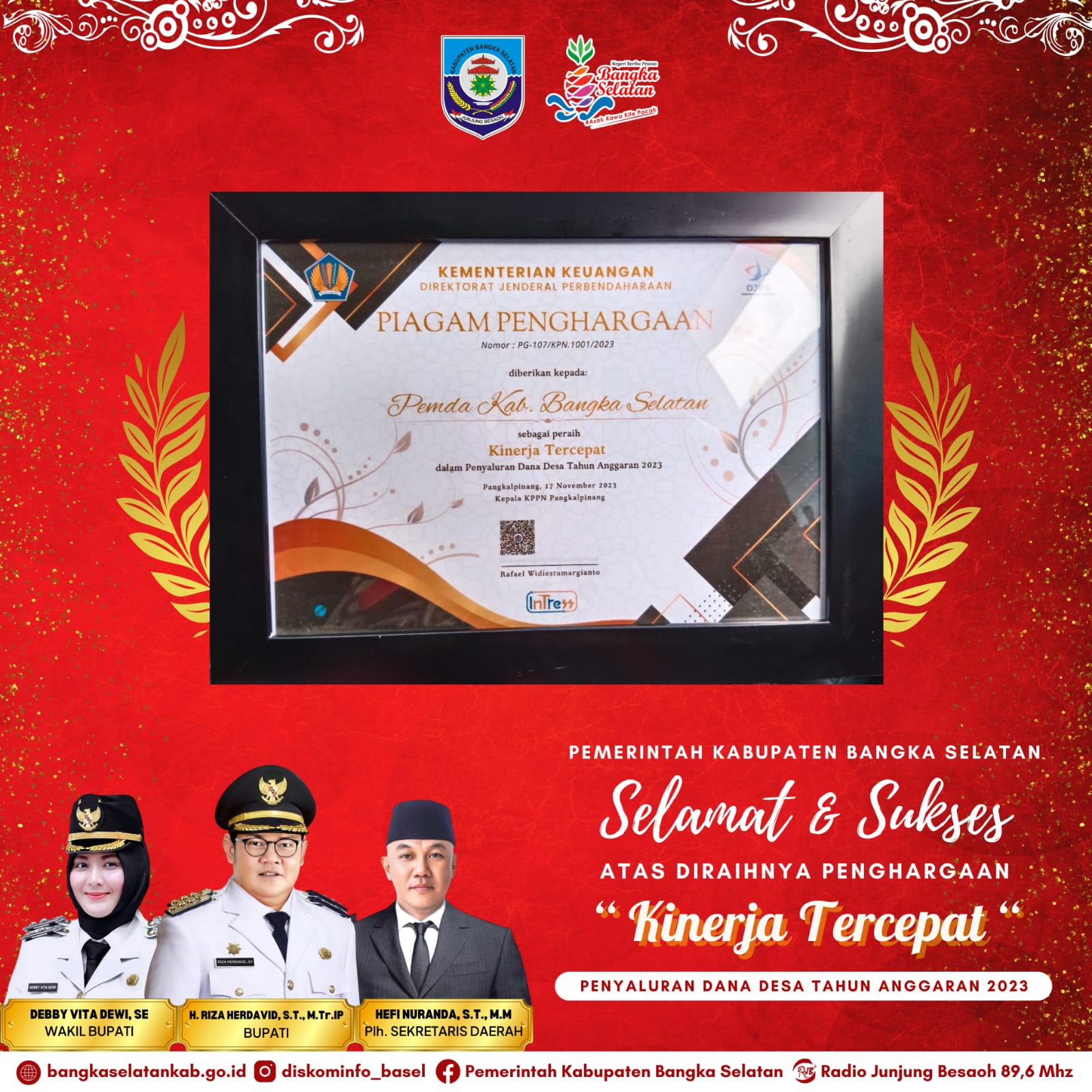 Bupati Bangka Selatan, Riza Herdavid mengatakan berdasarkan informasi pihak KPPN Pangkalpinang, Pemkab Bangka Selatan mendapatkan berhasil meraih Apresiasi Penghargaan Kinerja Tercepat Penyaluran Dana Desa se-Bangka Belitung Tahun 2023.
