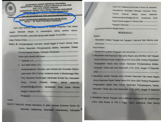 Untuk diketahui, PT TUN Makassar mewajibkan Pemkab Takalar untuk mencabut keputusan Tata Usaha Negara nomor 619 tahun 2022 tertanggal 15 Desember 2022 tentang pengesahan dan pengangkatan Kepala Desa Cakura kecamatan Polongbangkeng Selatan, atas nama Saharuddin S.Pd.
