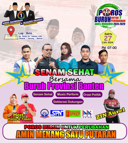 Sekilasindonesia.id, || SERANG – Para Aktivis Buruh Provinsi Banten yang tergabung Poros Buruh untuk perubahan Anis-Muhaimin, akan menggelar senam sehat bersama Buruh Provinsi Banten, para relawan Anis-Muhaimin, menebarkan inspirasi hidup sehat kepada para Buruh, yang akan di laksanakan pada hari Sabtu, 27 Januari 2024 pukul 07:00 WIB, di Lapangan Bola Kampung Baluk, Desa Nambo Udik, Kecamatan Cikande, Kabupaten Serang Banten, Rabu, (24/01/2024)