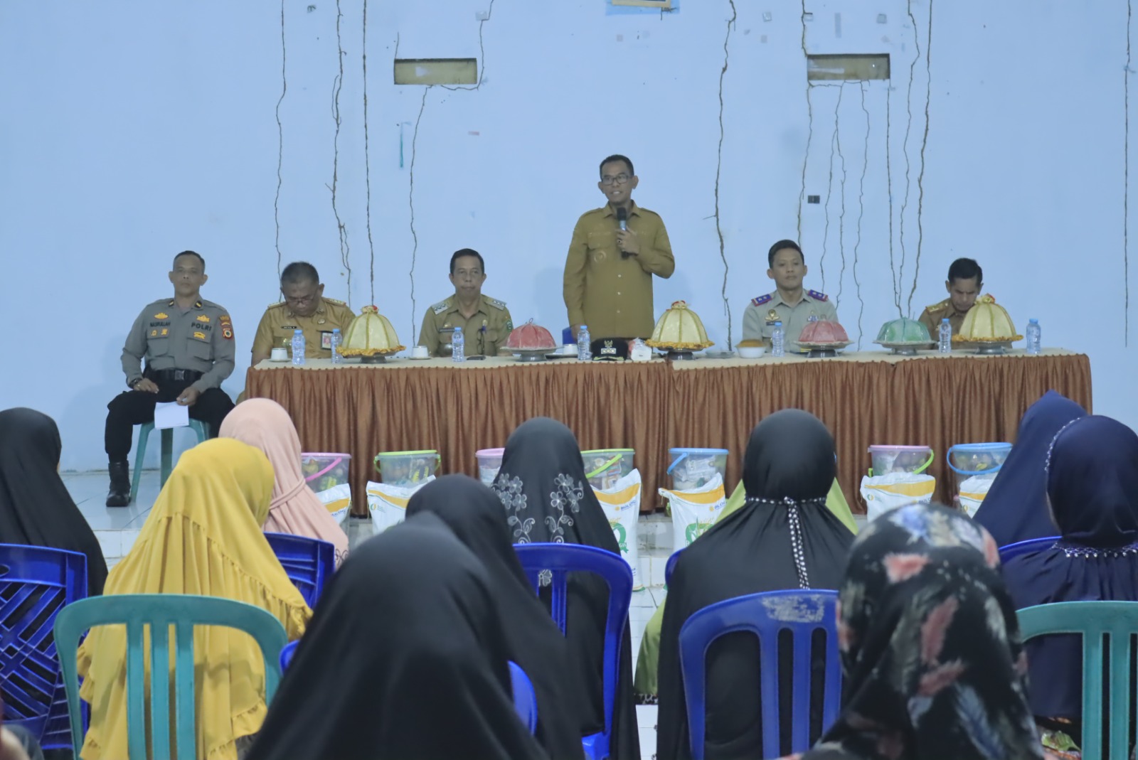 menyerahkan beberapa bantuan berupa beras bulog bantuan cadangan pangan dari pemerintah, sertifikat tanah gratis, dan penyerahan sembako untuk lansia.