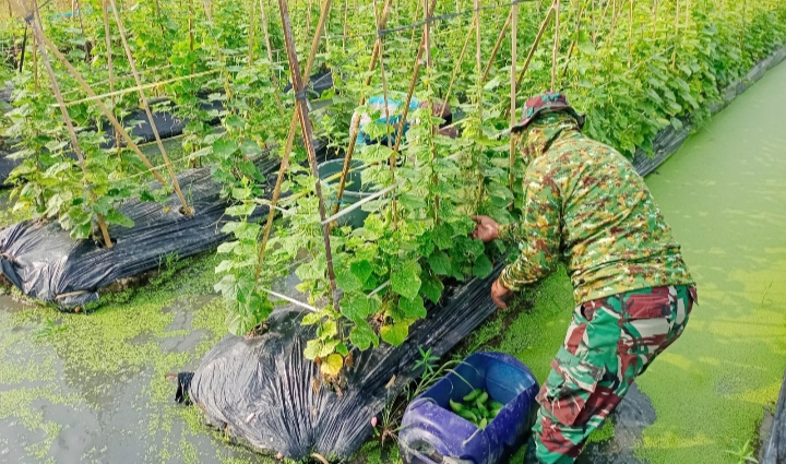 “Danramil 2302/Bojonegara memaparkan bahwa hari ini memberikan tugas pada Anggotanya Babinsa Desa Mangkunegara dan Babinsa Desa Kertasana untuk (Bintahwil) panen timun dan pemasangan mulsa di dua Desa yang sudah ditentukan,” papar Mayor Caj(K) Ana Dahliana.