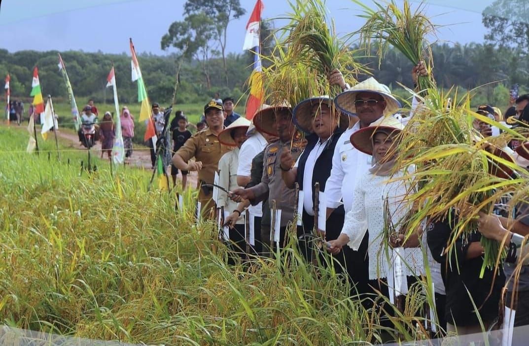 Pj Bupati Bangka M. Haris bersama Pj Gubernur Babel, Safrizal melakukan panen perdana padi sawah bersama jajaran forkompinda Bangka Belitung.