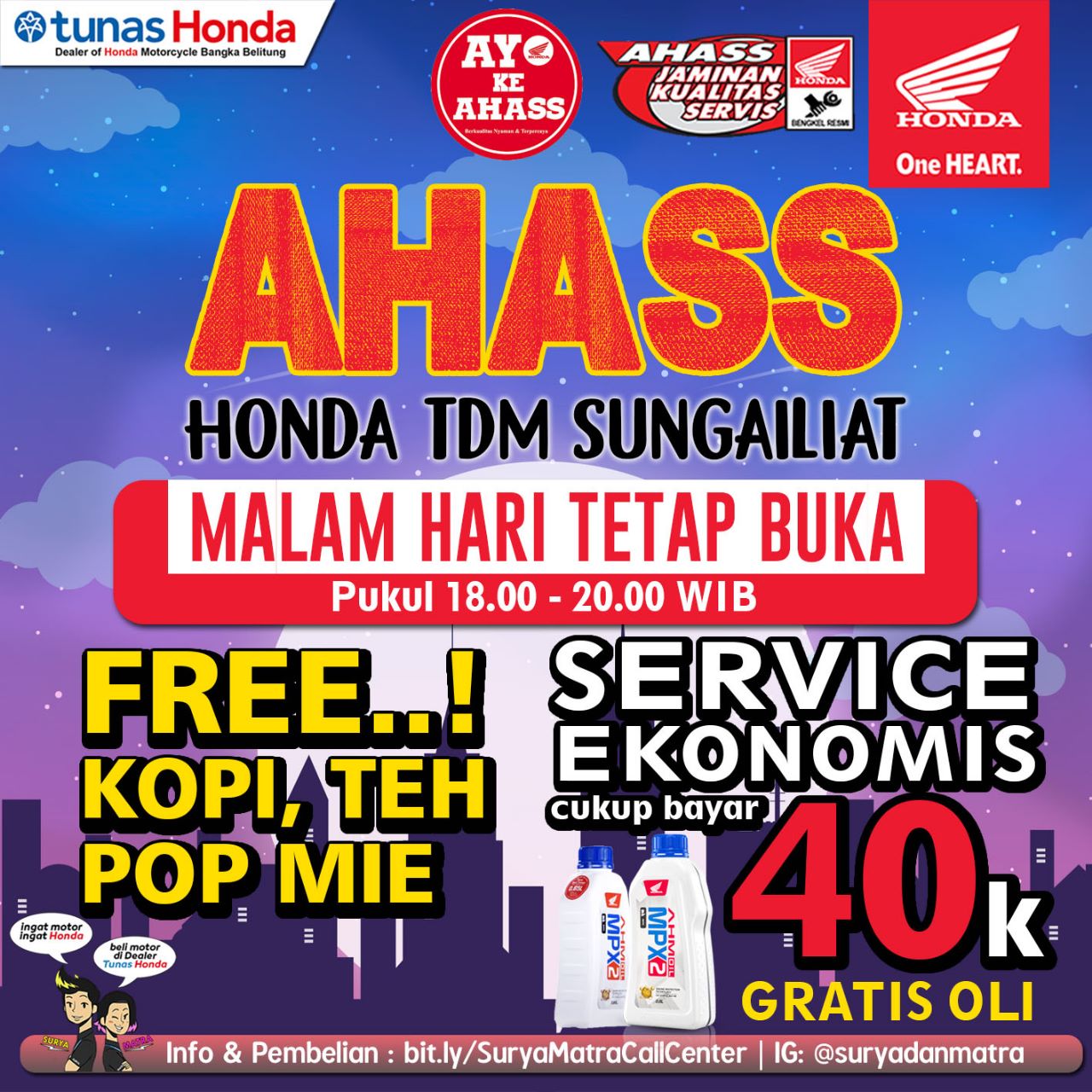 “Bentuk kepedulian kami kepada konsumen setia motor Honda yang ada di Kota Sungailiat dan sekitarnya, bengkel resmi AHASS Honda Babel cabang TDM Sungailiat siap melayani konsumen hingga pukul 20.00 WIB,” ungkap Romy Kepala Cabang Honda TDM Sungailiat.