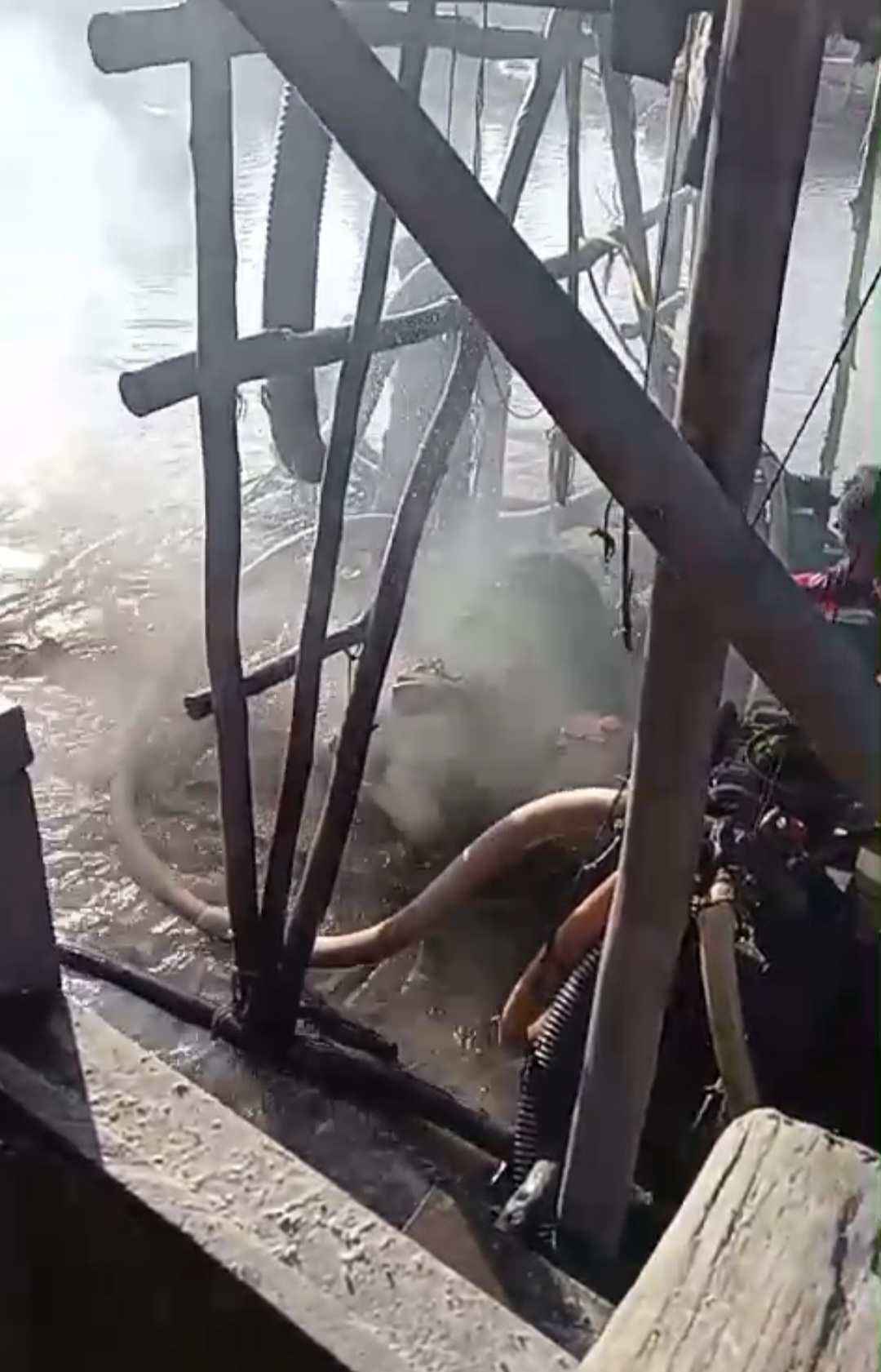 BATU BETUMPANG-Aktifitas Tambang Timah jenis Ponton Rajuk Isap yang diduga ilegal masuk kawasan Hutan Lindung (HL) bebas beraktifitas di Alur Anak Sungai Laut Desa Betumpang Kecamatan Pulau Besar Kabupaten Bangka Selatan Provinsi Kepulauan Bangka Belitung, Selasa (02/04/2024).