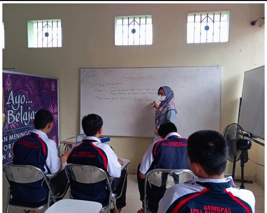 Kegiatan belajar mengajar tersebut dipimpin langsung oleh guru pengajar dari PKBM Ummi Salamah, dengan didampingi oleh staf Dikbimkemas LPKA Kelas II Pangkalpinang, Kasdar.