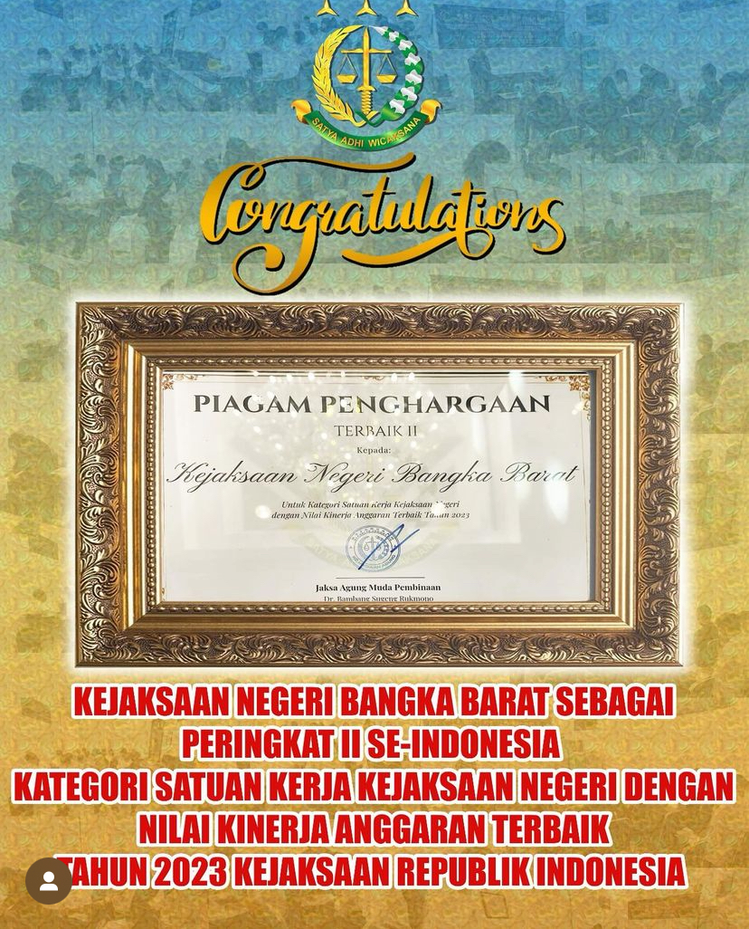 Penghargaan itu diterima Kejaksaan Negeri Bangka Barat dalam acara Musyawarah Perencanaan Pembangunan (Musrenbang) Kejaksaan RI 2024 di Hotel Ayodya Resort Nusa Dua Bali pada Jumat (26/4/2024).