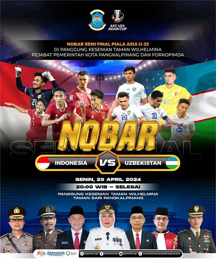 Pemerintah Kota Pangkalpinang menggelar perhelatan nonton bareng (nobar) pertandingan semifinal Piala Asia U-23 antara Timnas Indonesia U-23 Vs Uzbekistan U-23 yang dilaksanakan di Panggung Kesenian Taman Wilhelmina Taman Sari Pangkalpinang, Senin malam, (29/4/2024).
