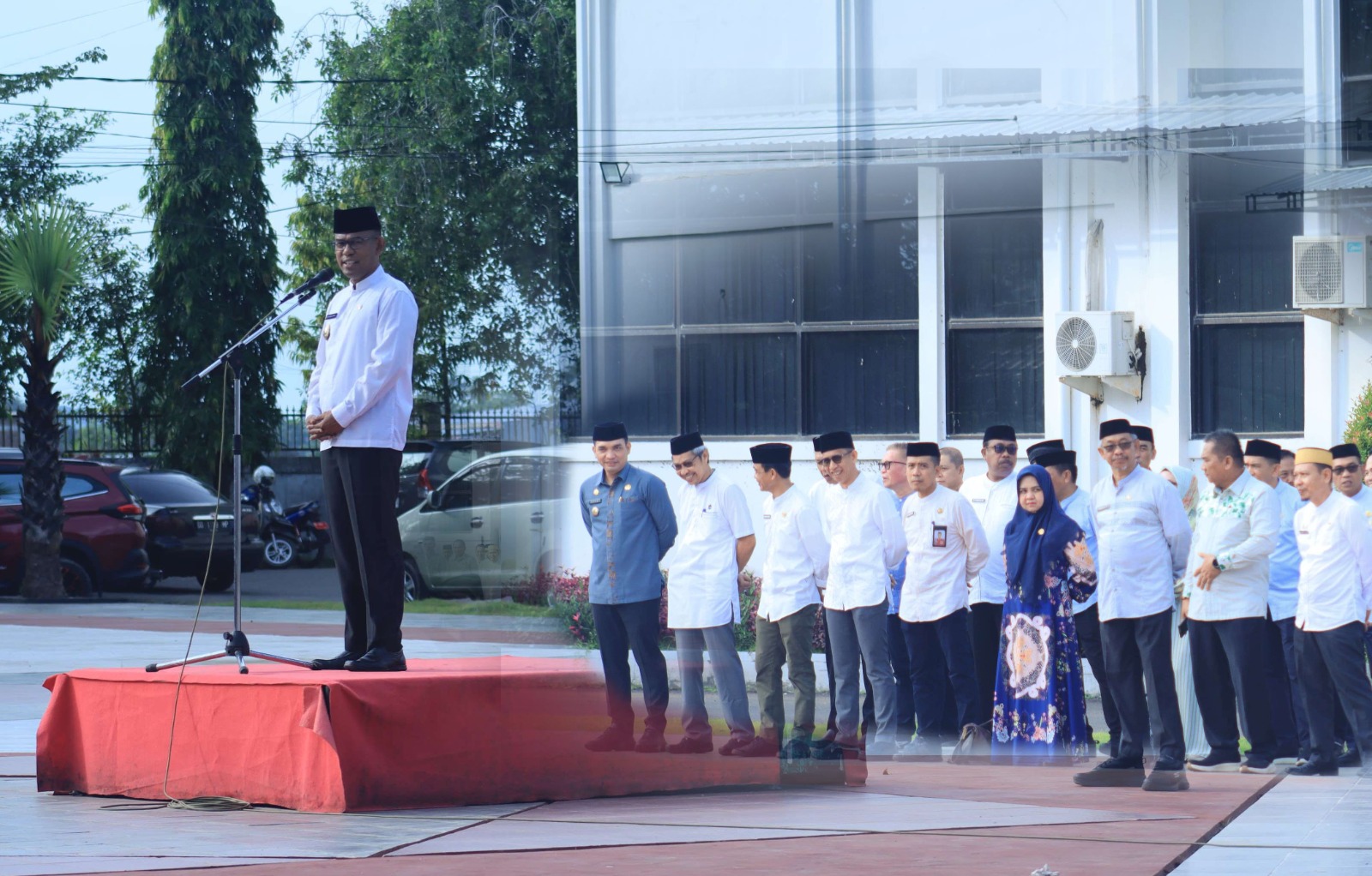 Pj. Bupati Takalar Dr. Setiawan Aswad .M.Dev,.Plg memimpin apel gabungan OPD Lingkup Pemerintah Kab. Takalar di Lapangan Upacara Kantor Bupati Takalar Senin (6/5/2024).