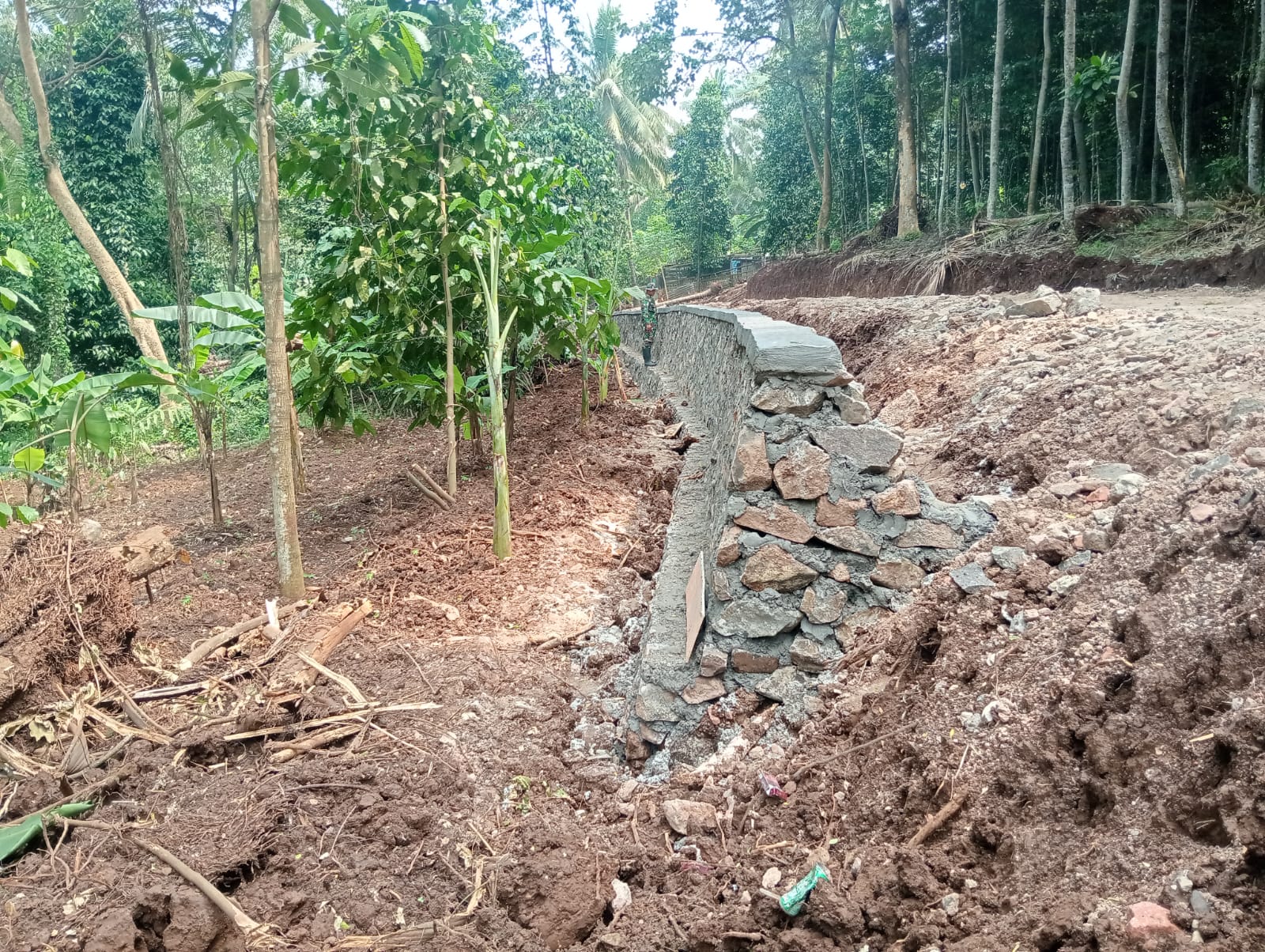 Menurut keterangan dari Bati Ter Kodim 0623/Cilegon Serda Uung Suryana, sementara ini kita membangun gorong-gorong itu ada tiga titik diantaranya titik nol ini sudah 100 persen kita pasang, selanjutnya akan kita kerjakan dititik tengah dan dititik tiga berada di area kebun jati.