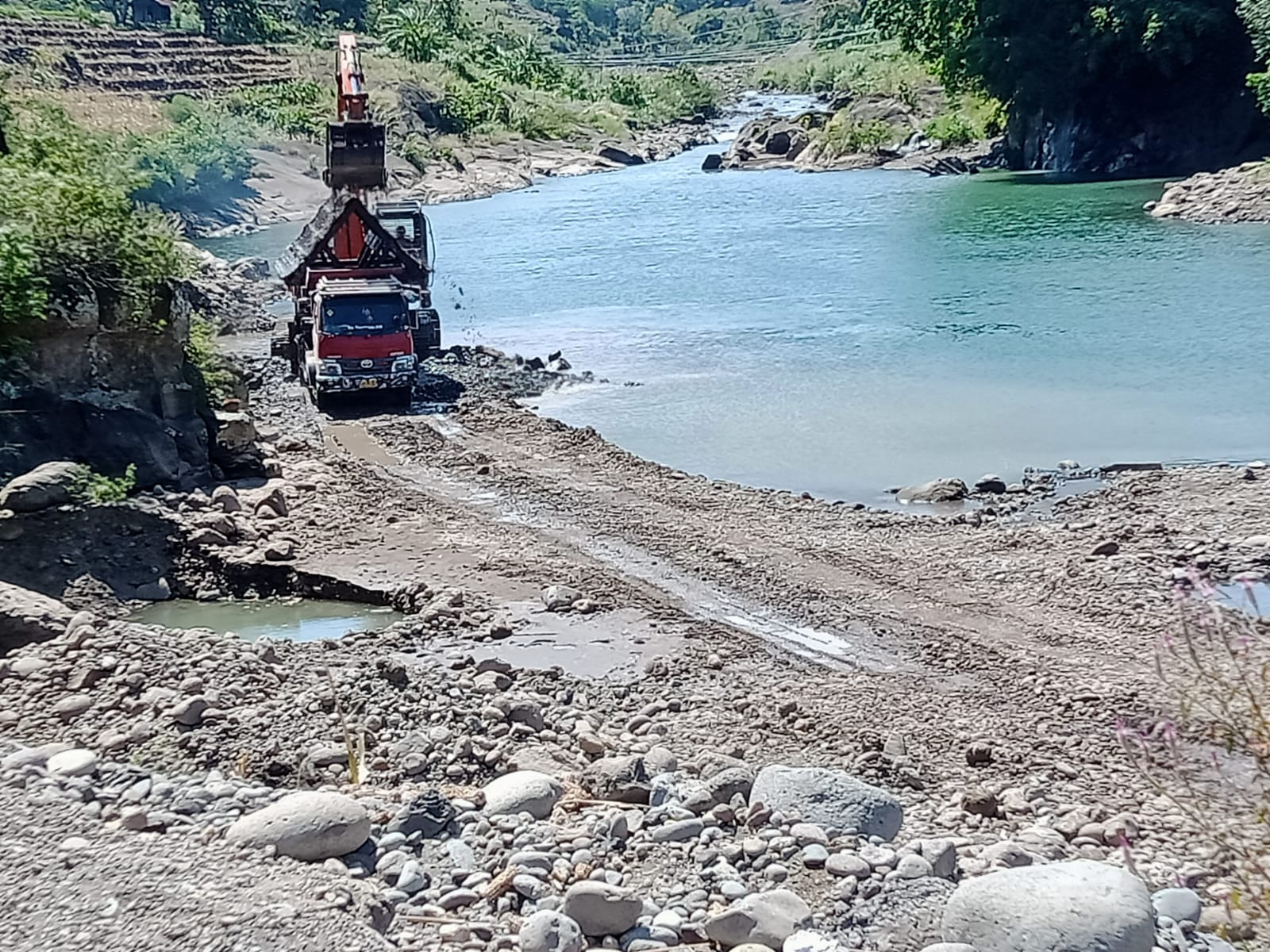 Sesuai pantauan awak media, pada saat berkunjung ke lokasi pertambangan milik Awing, Satu unit kendaraan alat berat berupa Ekskavator sedang mengeruk isi sungai dalam bentuk pasir dan mengisi kendaraan mobil enam roda yang stembai di sungai.