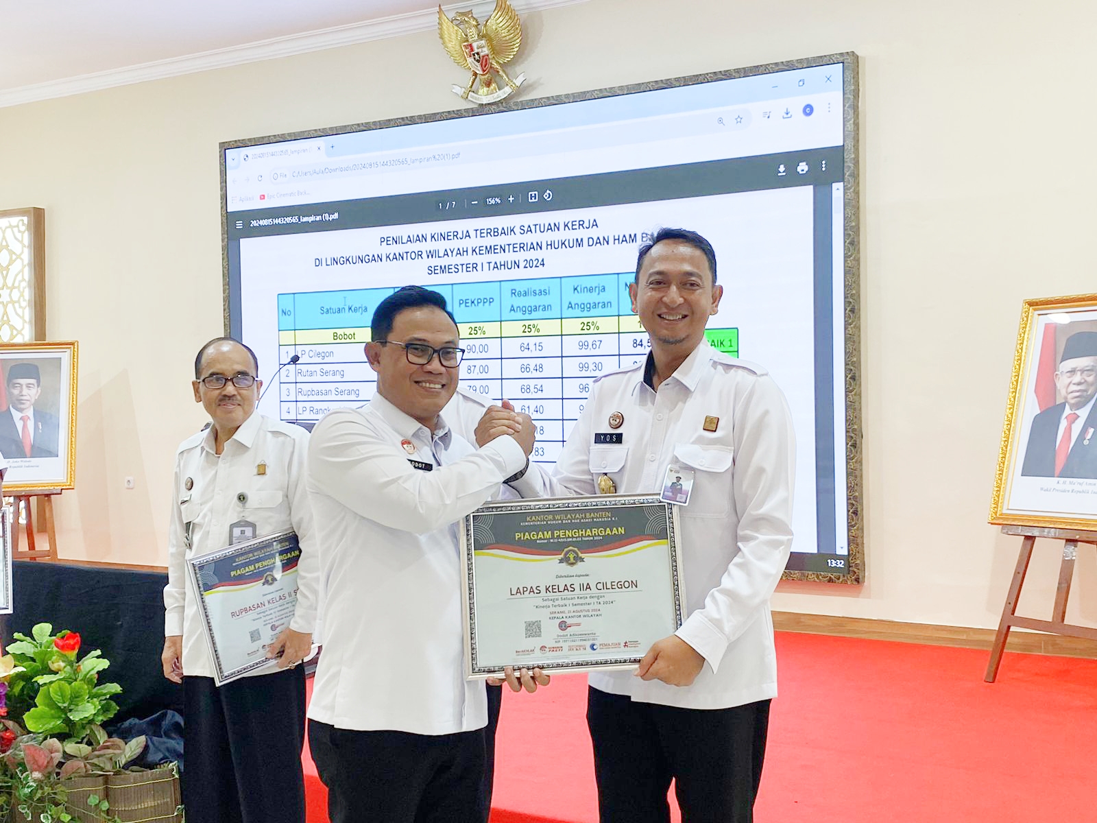 Berdasarkan Keputusan Kepala Kantor Wilayah Kemenkumham Banten tentang Pemberian Penghargaan Satuan Kerja Berkinerja Terbaik Semester I Tahun 2024, Lapas Cilegon dinobatkan sebagai penerima penghargaan “Kinerja Terbaik I Semester I TA 2024”.